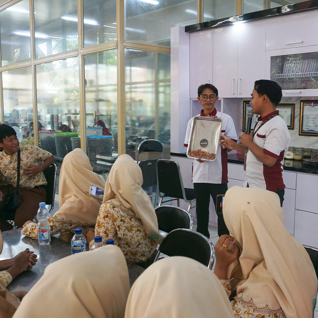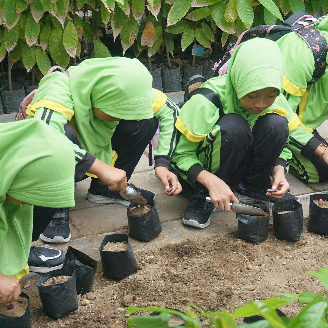 Sesi pertama dimulai di area Tani Modern. Di area ini, siswa dikenalkan pada tahapan dasar pembibitan kakao, termasuk pengenalan media tanam dan cara menyemai biji. Tidak sekadar menyimak, mereka juga langsung praktik menanam biji kakao ke dalam polybag, melatih kepekaan, kesabaran, dan tanggung jawab terhadap tanaman.