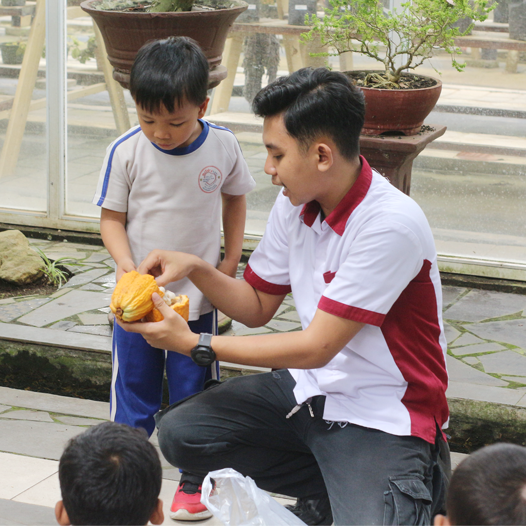 Usai kegiatan menanam, anak-anak diajak mengenal buah kakao secara lebih dekat. Mereka mengamati bentuk dan ukuran buah kakao, belajar cara memetik serta membuka buah kakao, lalu melihat biji kakao di dalamnya. Kesempatan mencicipi daging buah kakao menjadi pengalaman baru yang membantu anak-anak memahami bahwa cokelat yang mereka sukai berasal dari buah kakao.