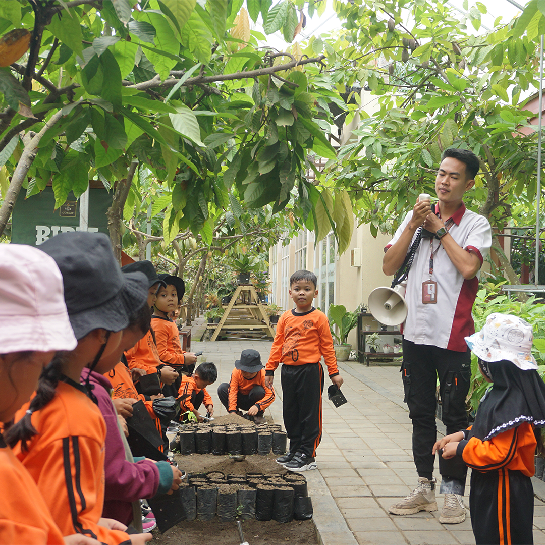 Kegiatan dimulai di area Tani Modern, tempat anak-anak diperkenalkan pada proses pembibitan kakao. Dengan penjelasan yang sederhana, mereka belajar bagaimana bibit kakao dirawat sejak awal. Setelah memahami tahapannya, anak-anak langsung diajak mempraktikkan cara menanam bibit kakao sendiri. Aktivitas menanam ini menjadi momen seru karena mereka dapat menyentuh tanah, mengisi polybag, dan menanam bibit kakao dengan tangan mereka sendiri.