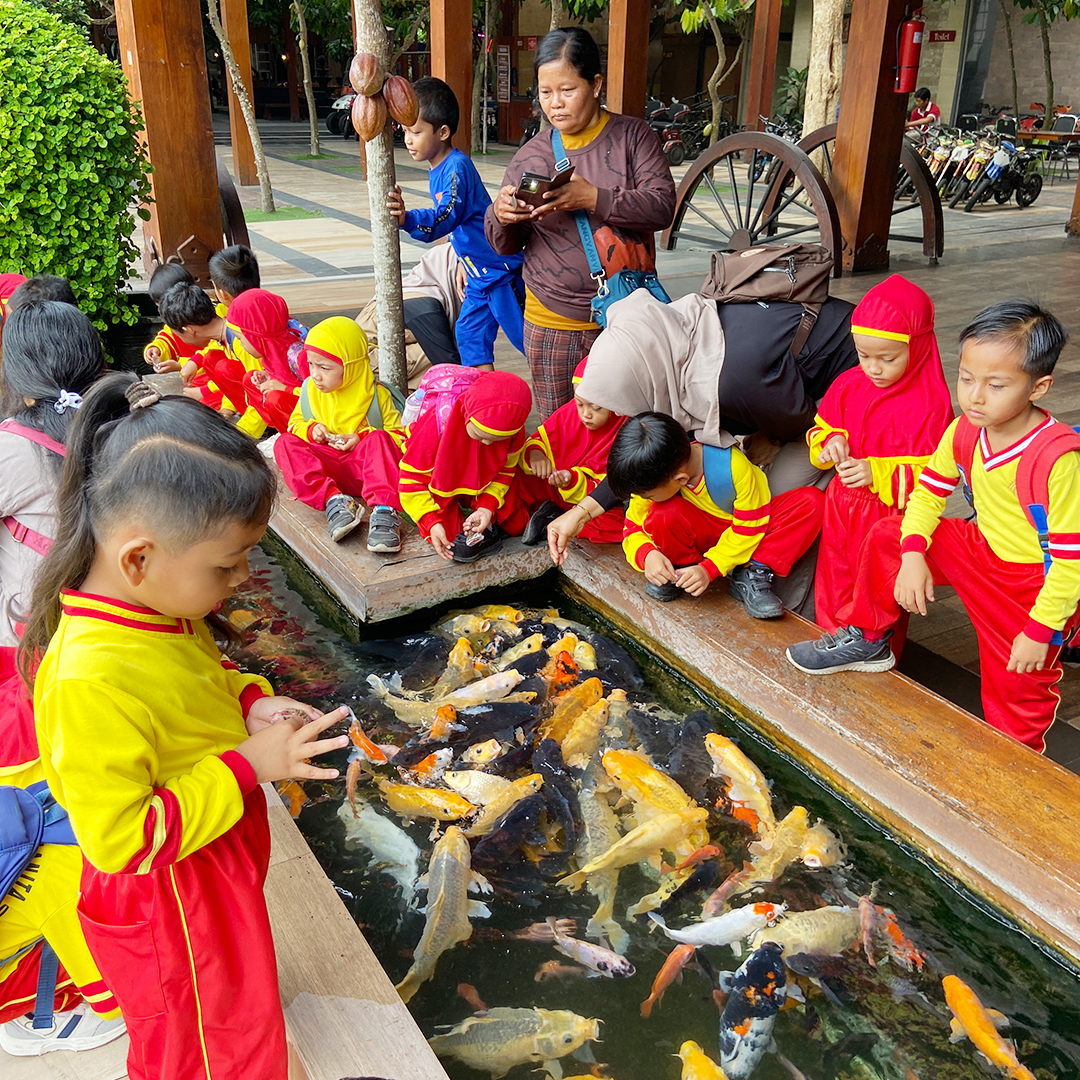 Dari sana, rombongan melangkah menuju depan Galeri Cokelat. Anak-anak dibagikan pakan ikan dan memberi makan ikan koi yang berwarna-warni. Aktivitas ini menjadi penutup yang menyenangkan, sekaligus mengajarkan anak-anak tentang kasih sayang terhadap hewan air.