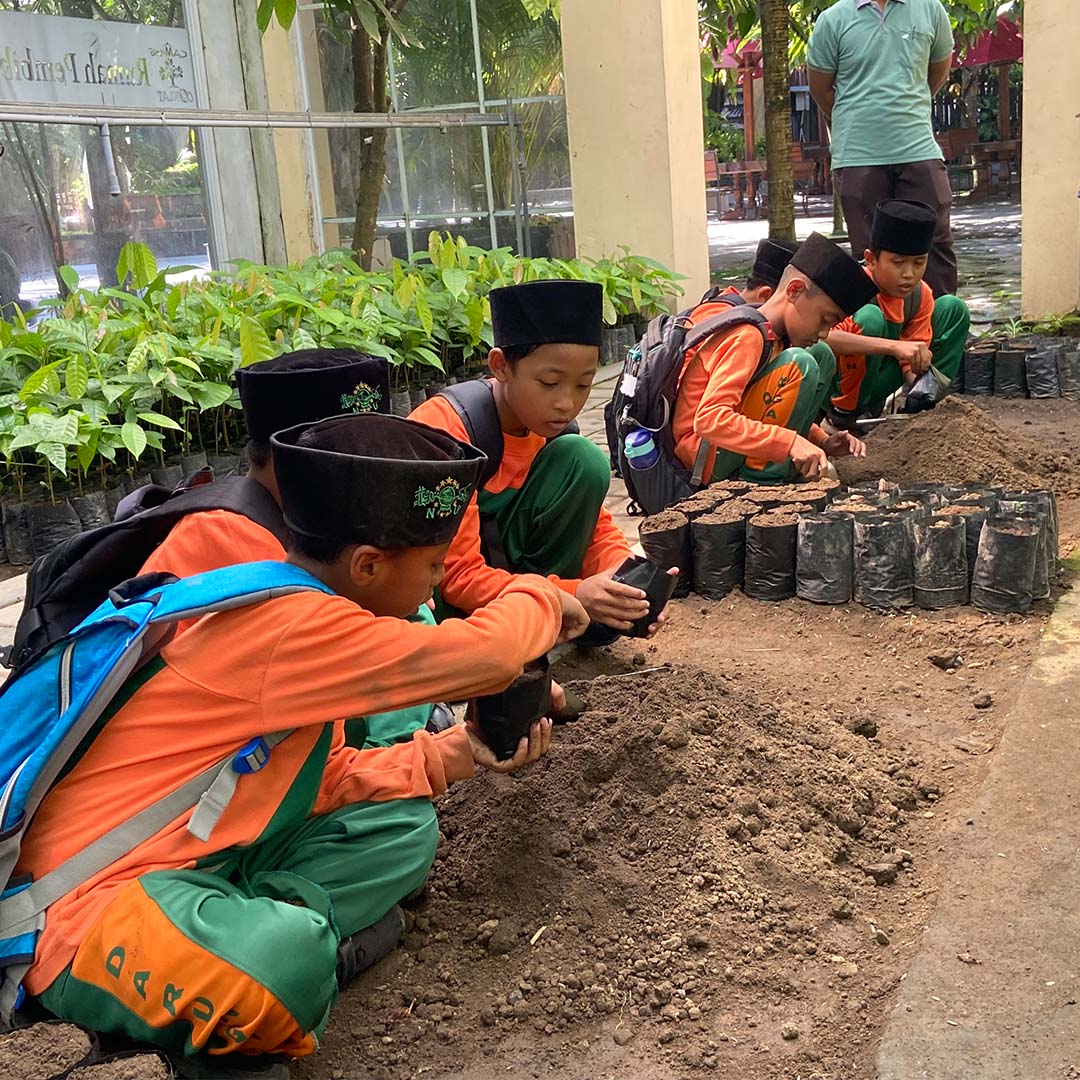 Perjalanan edukasi dimulai dengan eksplorasi di area Tani Modern, tempat anak-anak diperkenalkan pada tanaman kakao. Mereka belajar mengenali bentuk pohon dan daun kakao, serta melihat langsung bagaimana bibit kakao ditanam.