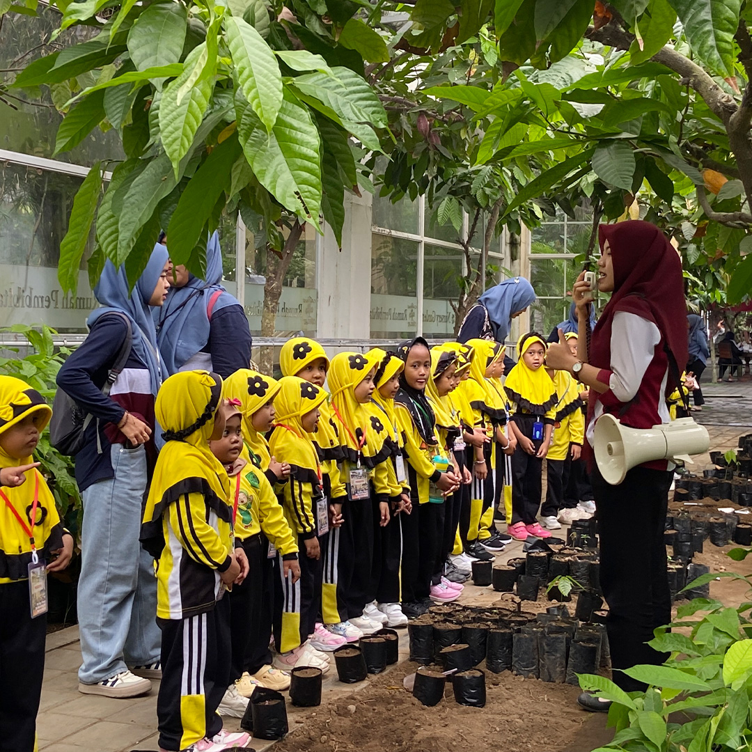 Tahap Merefleksi menutup kegiatan dengan suasana penuh cerita. Anak-anak diajak mengulang kembali pengalaman mereka, mulai dari menanam bibit, mencoba buah kakao, hingga menghias cokelat. Dengan bimbingan guru dan pendamping, mereka belajar menyampaikan apa yang mereka pahami, apa yang paling mereka sukai, dan hal baru apa yang mereka temukan hari itu. Proses refleksi ini membuat pembelajaran terasa lebih bermakna dan melekat pada ingatan mereka.