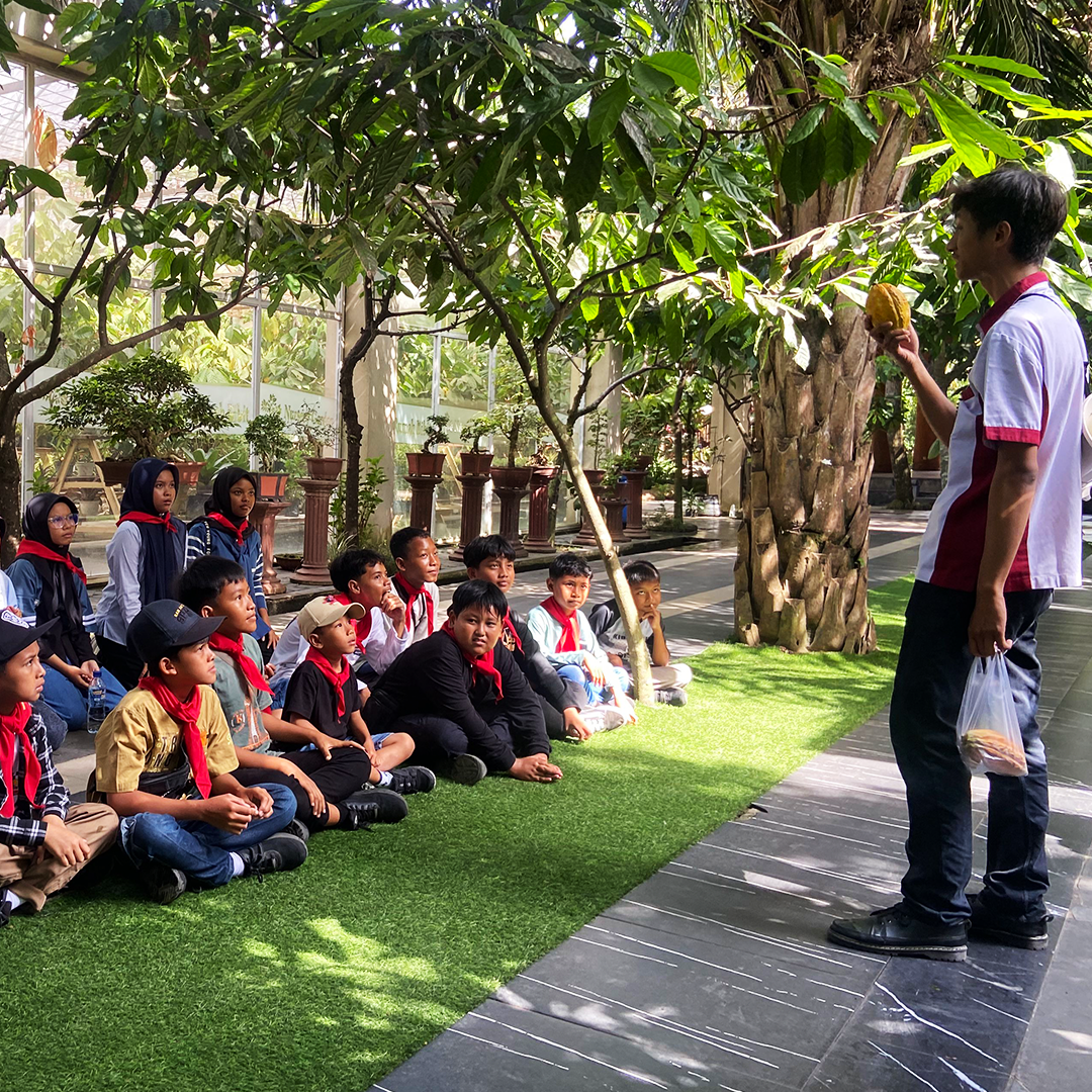 Tahap Mengaplikasi menjadi ruang praktik nyata bagi para siswa. Mereka menanam biji kakao langsung di polybag, mempraktikkan cara membuka buah kakao, bahkan mencicipi daging buahnya yang segar. Antusiasme semakin meningkat saat masuk ke Cooking Class, di mana siswa menghias cokelat sesuai kreativitas masing-masing dan menikmati lembutnya cokelat fountain yang selalu menjadi favorit.