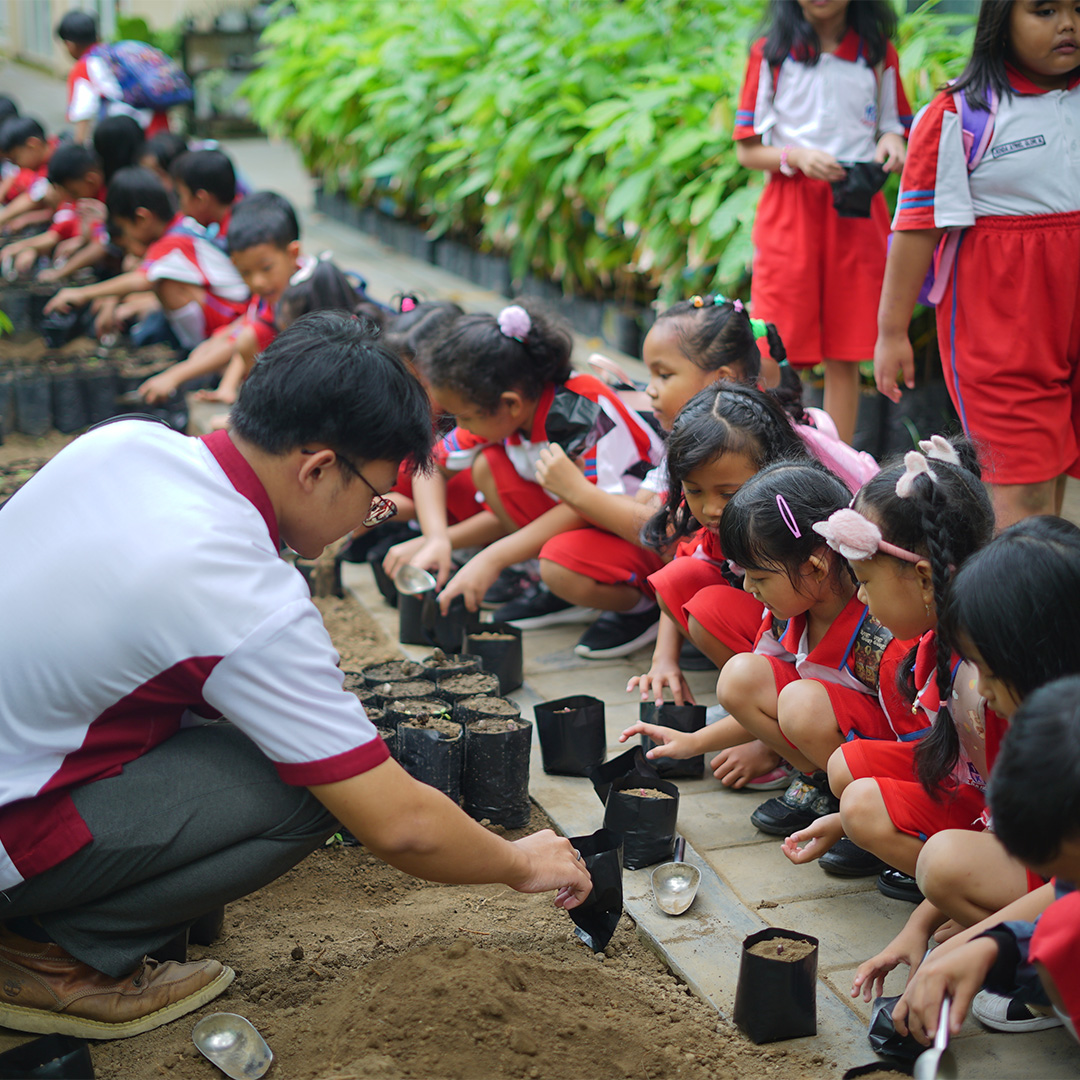 Kunjungan dimulai di area Tani Modern, tempat siswa belajar tentang bibit kakao. Mereka dikenalkan pada media tanam yang tepat dan diajak langsung mencoba menanam bibit kakao. Kegiatan ini membantu anak-anak memahami pentingnya tahap awal dalam proses budidaya.