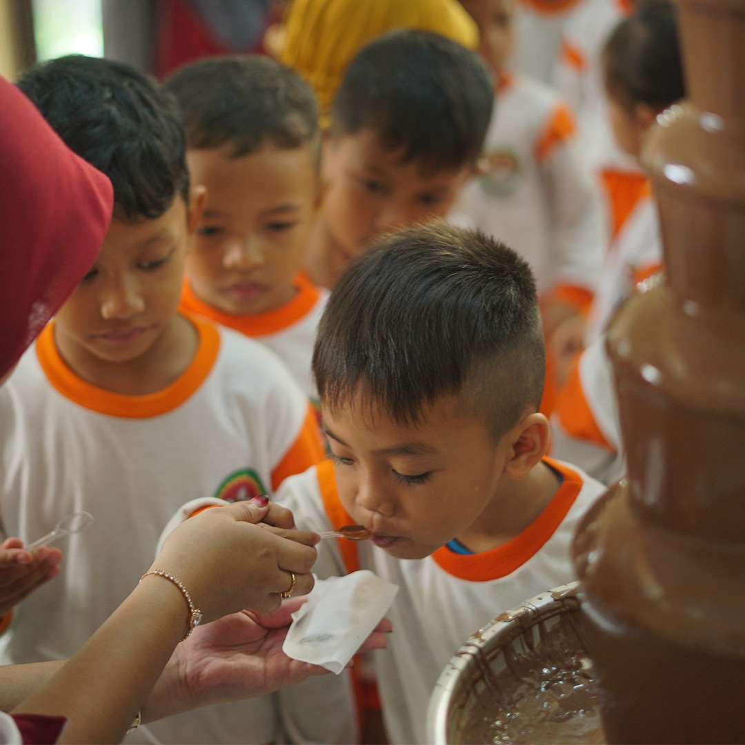 Usai dari pabrik, rombongan menuju Cooking Class, di mana anak-anak bisa menikmati manisnya cokelat langsung dari aliran cokelat fountain. Momen ini tidak hanya memberi pengalaman rasa, tapi juga memperkenalkan dunia kuliner cokelat secara langsung.