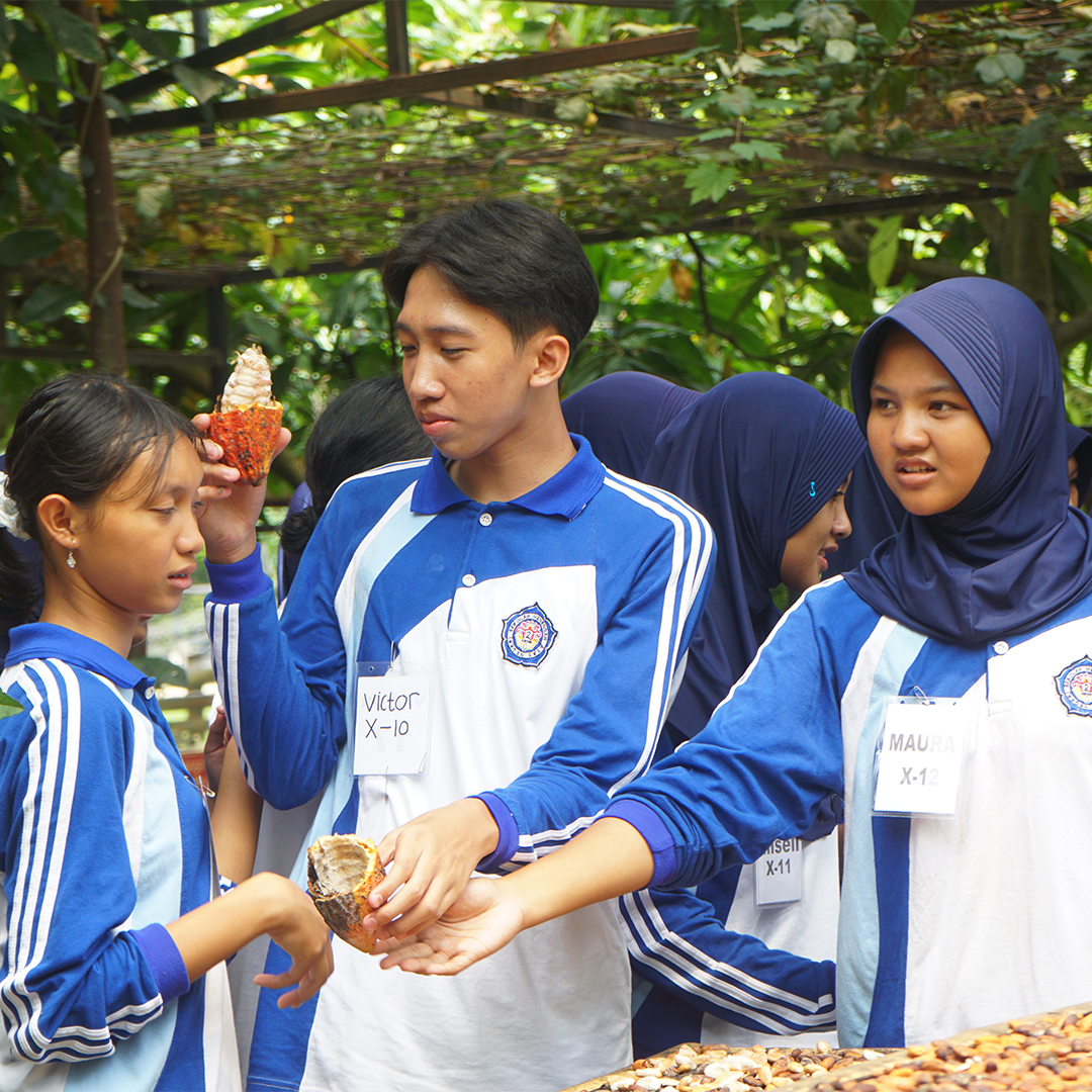 Kunjungan dimulai dengan eksplorasi ke area Tani Modern. Anak-anak diajak memahami proses pembibitan kakao, mulai dari cara memilih media tanam hingga praktik langsung menanam bibit kakao. Aktivitas ini memberikan gambaran nyata tentang proses awal dari pohon kakao hingga menghasilkan biji cokelat.