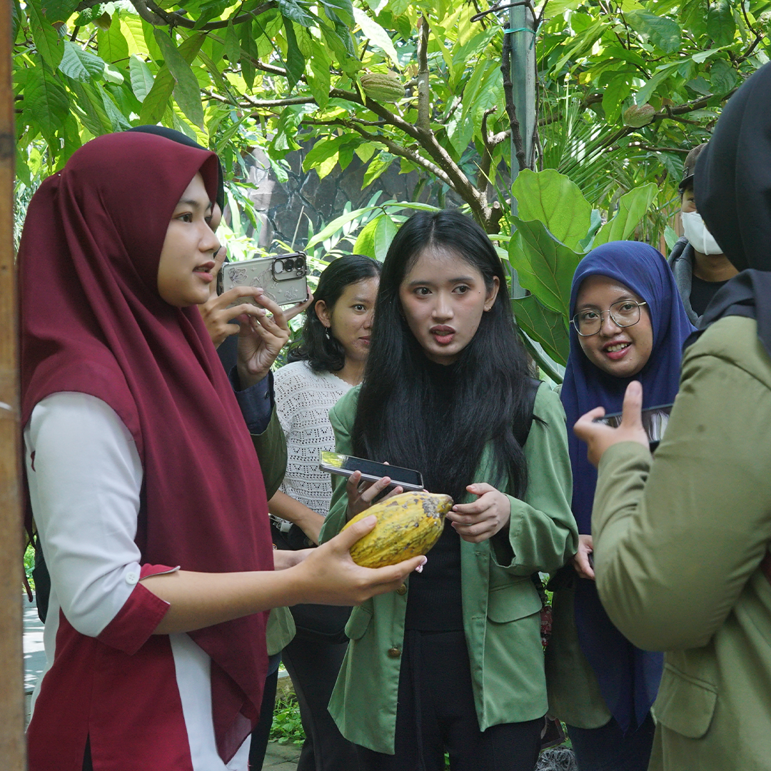 Selanjutnya, mereka mempelajari lebih dalam tentang buah kakao, mulai dari bentuk, warna, hingga cara membukanya. Kegiatan ini makin menarik saat anak-anak diberi kesempatan untuk mencicipi buah kakao segar yang langsung diambil dari kebun.