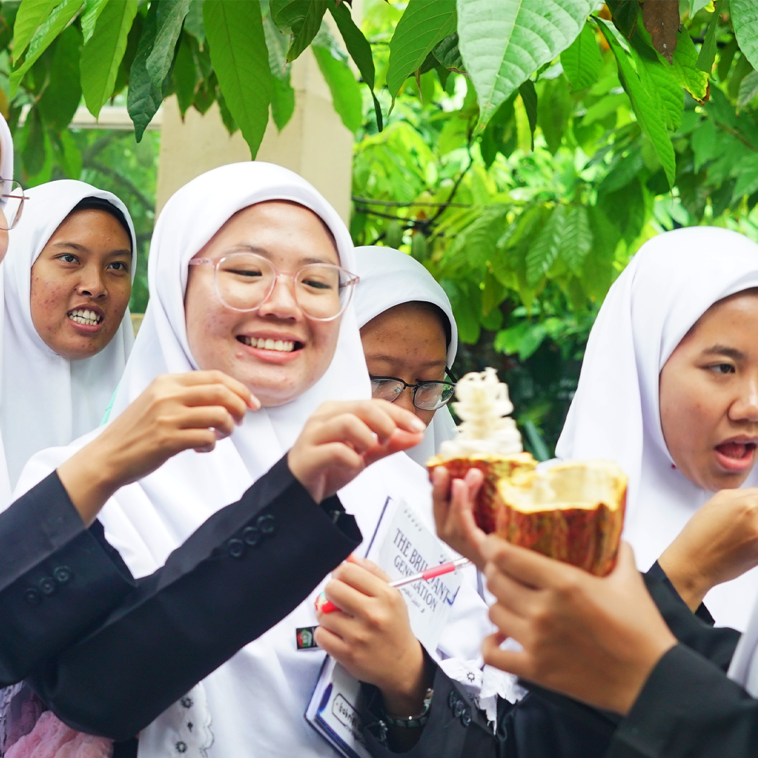 Pada tahap Mengaplikasi, santriwati diajak mengenal bahan-bahan dasar pembuatan cokelat dan menyaksikan hasil pengolahan secara langsung. Pengalaman belajar semakin menarik melalui kegiatan mencicipi cokelat dari chocolate fountain di Cooking Class, sehingga santriwati dapat merasakan secara langsung hasil akhir dari proses industri yang telah dipelajari.