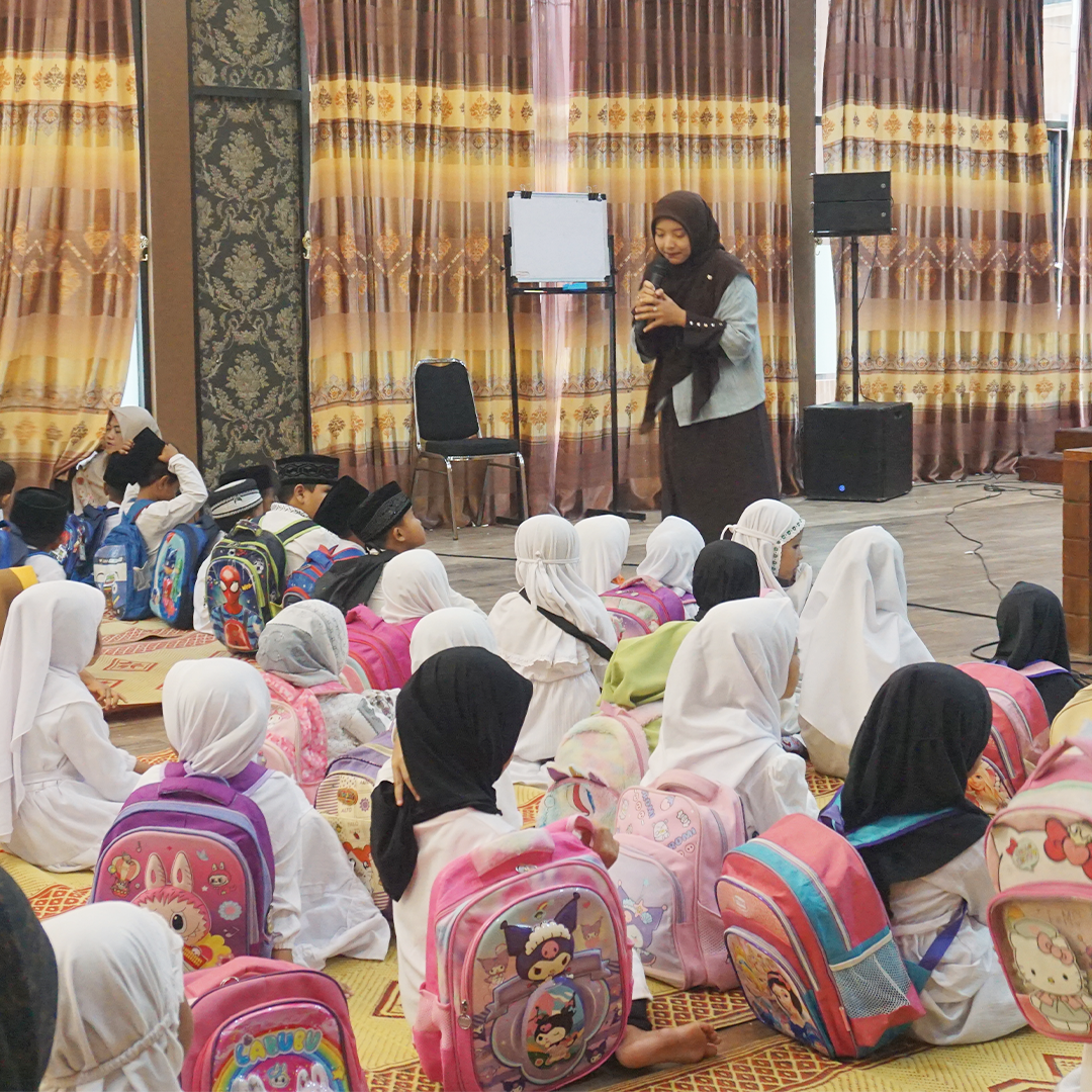 Setelah sholat Dhuha, peserta diajak melakukan tadabur alam sederhana di sekitar lingkungan sekolah. Anak-anak diperkenalkan pada ciptaan Allah seperti tanaman dan langit, serta diajak bersyukur atas nikmat yang diberikan sebelum memasuki sesi materi.