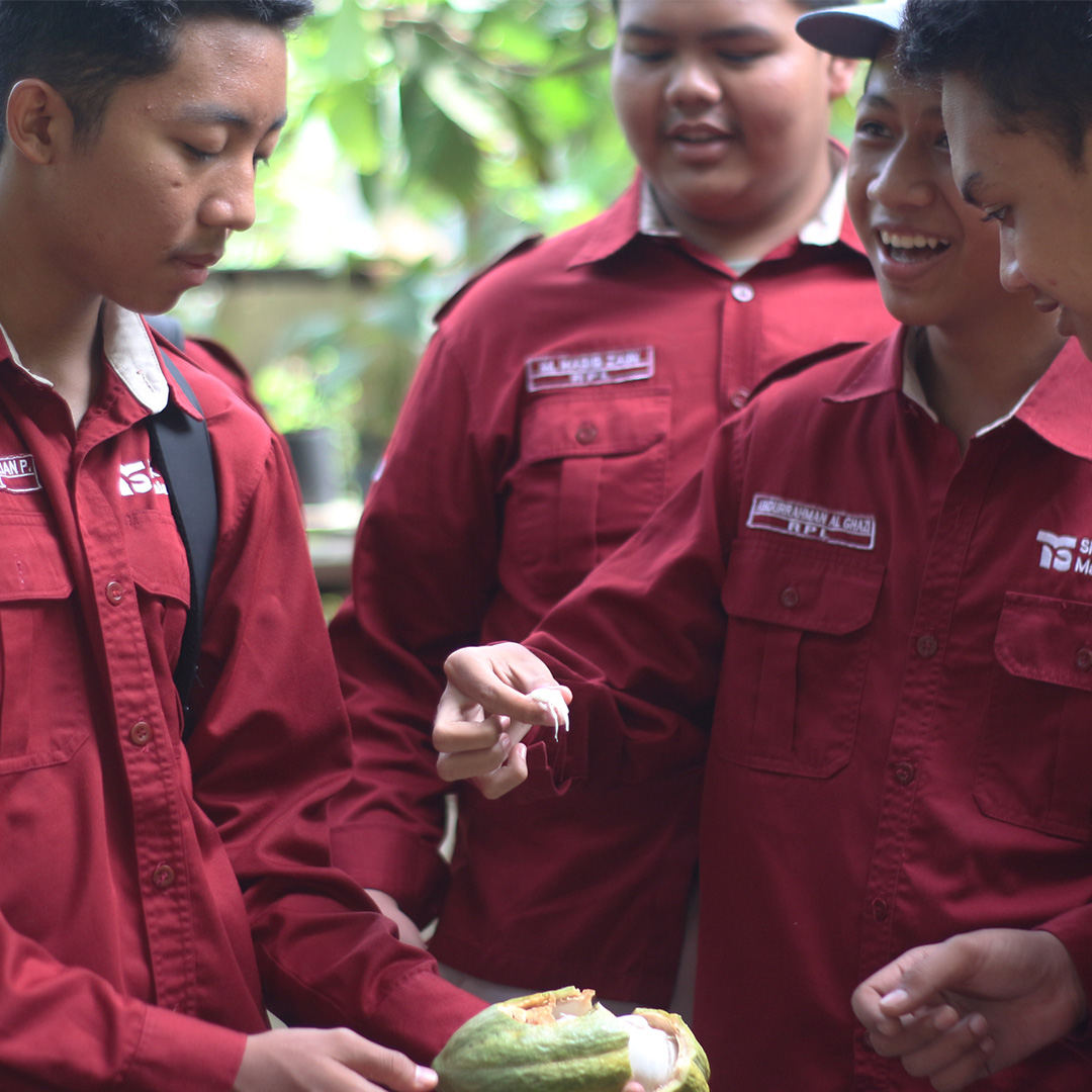Tahap Memahami diawali dengan pengenalan komoditas kakao sebagai bahan baku utama dalam industri cokelat. Siswa memperoleh penjelasan mengenai proses budidaya, penanganan pascapanen, hingga standar kualitas biji kakao yang baik. Kegiatan kemudian dilanjutkan dengan observasi langsung ke area produksi. Di pabrik cokelat, siswa mengamati alur kerja industri, mulai dari pengolahan bahan mentah, proses pencampuran, hingga tahap akhir sebelum produk siap dipasarkan. Mereka juga mengenal peran teknologi dan sistem kerja yang mendukung efisiensi produksi.