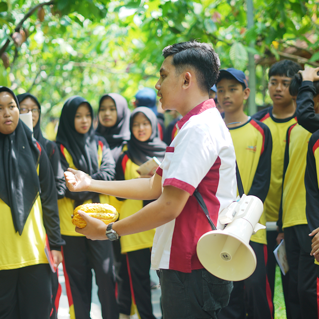 Tahap awal kegiatan diisi dengan pengenalan proses budidaya kakao di area pembibitan. Para siswa diajak memahami bagaimana biji kakao ditanam dan dirawat hingga siap panen. Setelah itu, mereka mengunjungi pabrik cokelat untuk melihat mesin produksi serta tahapan pengolahan cokelat siap konsumsi. Dari sesi ini, siswa memperoleh gambaran utuh tentang perjalanan kakao dari bahan mentah hingga menjadi produk bernilai jual tinggi.