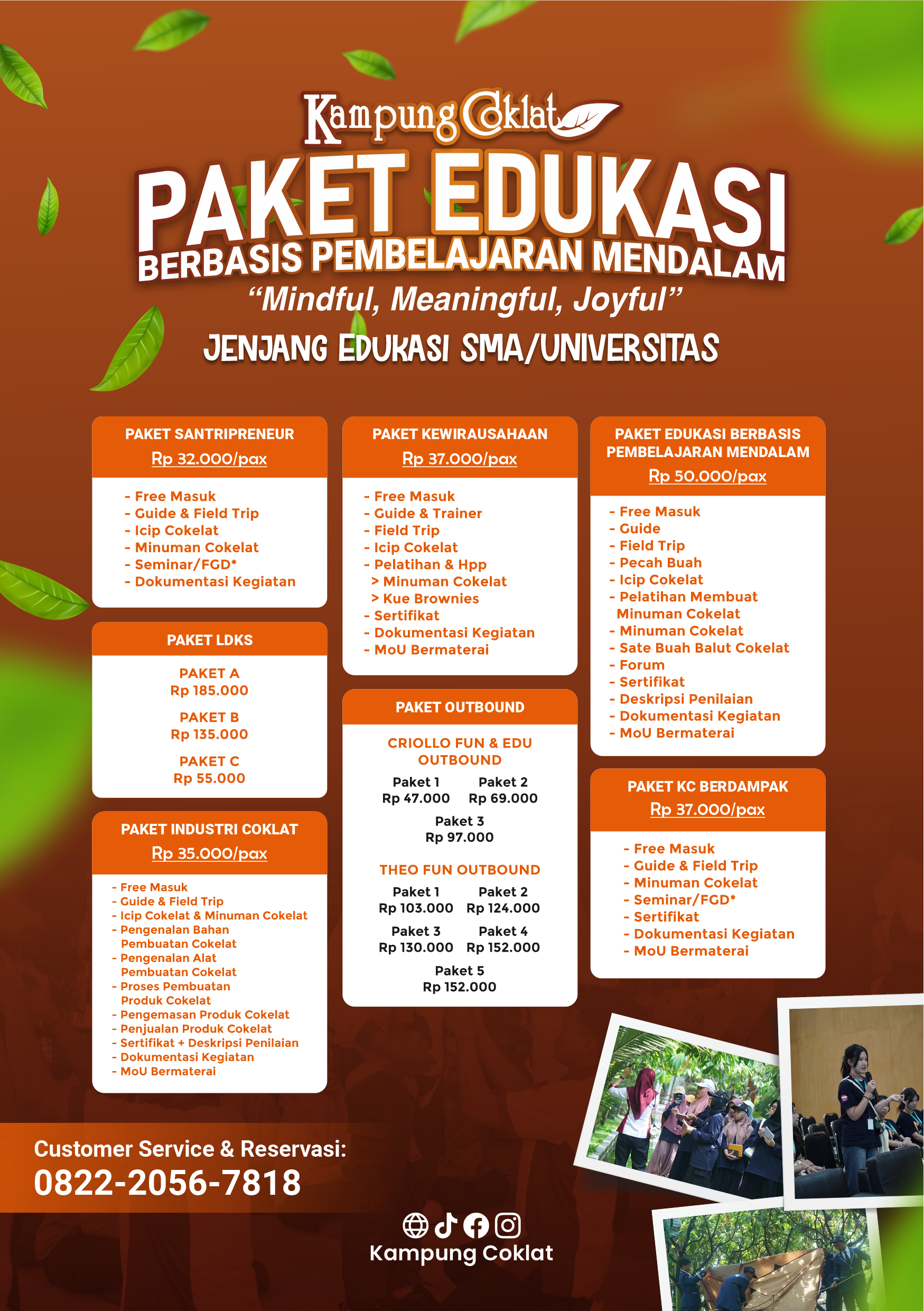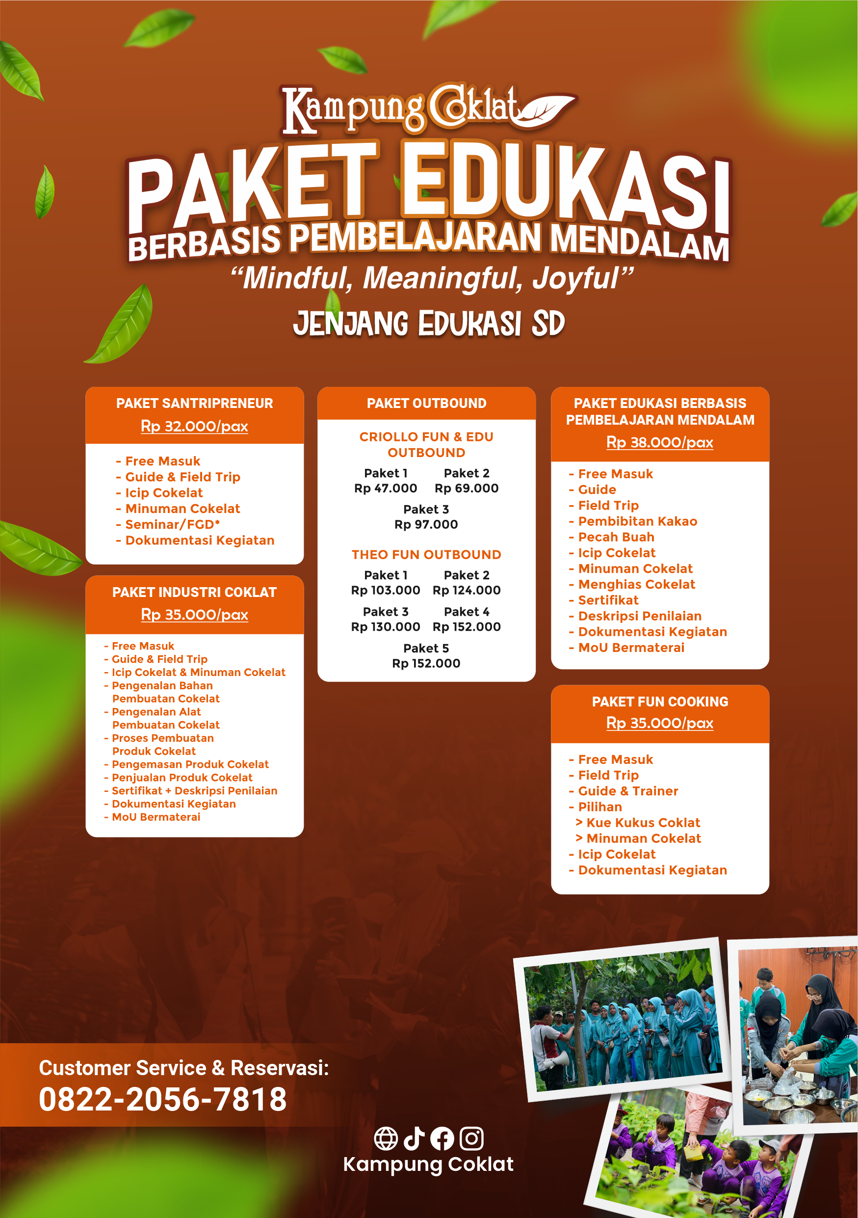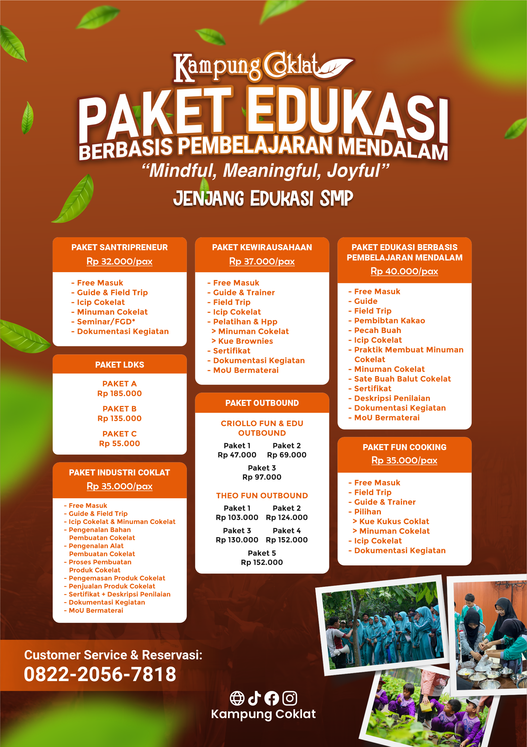Keunggulan berlibur ke Kampung Coklat adalah adanya Paket Edukasi yang selaras dengan kebijakan kurikulum pendidikan nasional. Program ini dirancang dengan pola pembelajaran mendalam melalui tiga pilar pengalaman belajar: Memahami, Mengaplikasi, dan Merefleksi. Melalui konsep ini, peserta didik tidak hanya memperoleh pengetahuan, tetapi juga mampu mempraktikkan serta mengevaluasi pengalaman belajarnya secara nyata. Dengan pendekatan pembelajaran yang mindful, meaningful, dan joyful, kegiatan edukasi di Kampung Coklat menjadi pengalaman belajar yang utuh, menyenangkan, dan berkesan. Kami menawarkan 9 jenis Paket Edukasi bisa Anda dapatkan dengan harga yang sangat terjangkau dengan fasilitas yang lengkap, antara lain (1) Paket Kewirausahaan; (2) Paket Edukasi Berbasis Pembelajaran Mendalam; (3) Paket Industri Cokelat; (4) Santripreneur; (5) Paket Inklusi; (6) Paket KC Berdampak; (7) Paket Kokurikuler; (8) Paket Fun Cooking; serta (8) LDKS.